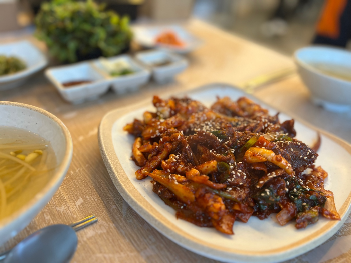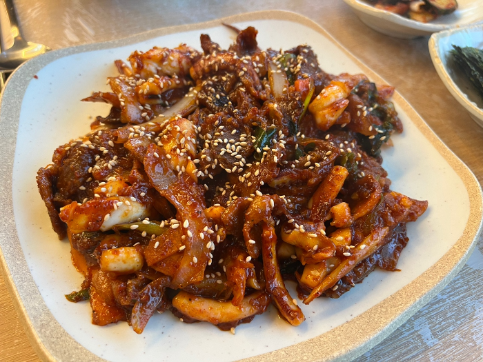 곧이어 오징어&돼지 두루치기가 한 접시에 같이 나와 완벽한 한상이 차려졌어요.