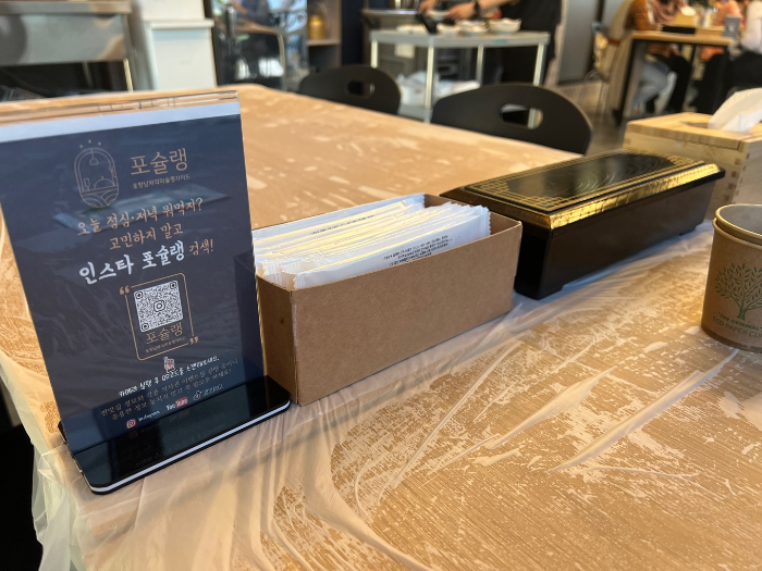 테이블마다 물티슈, 티슈, 수저통이 놓여있고 비닐이 깔려있어 위생적으로는 좋았지만 환경을 생각하면 지구에게 미안하네요.